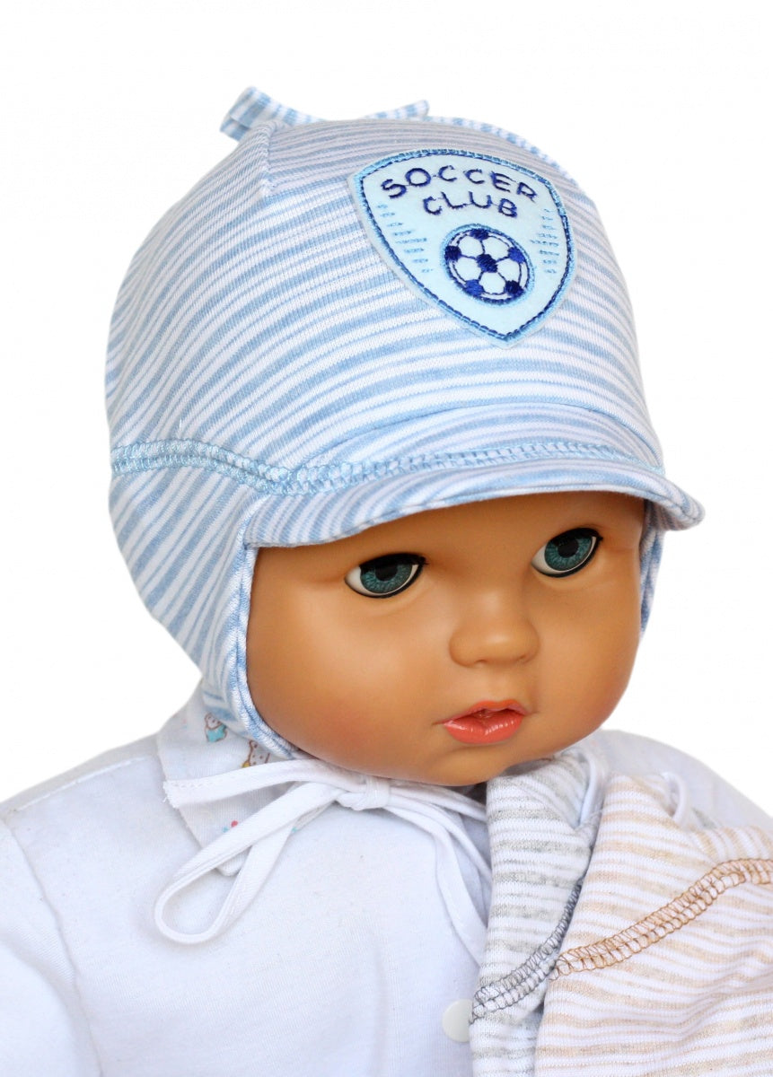 Hat for a baby boy with laces. Available in sizes 40 42 44 46. Colours: blue, brown,grey and salmon.