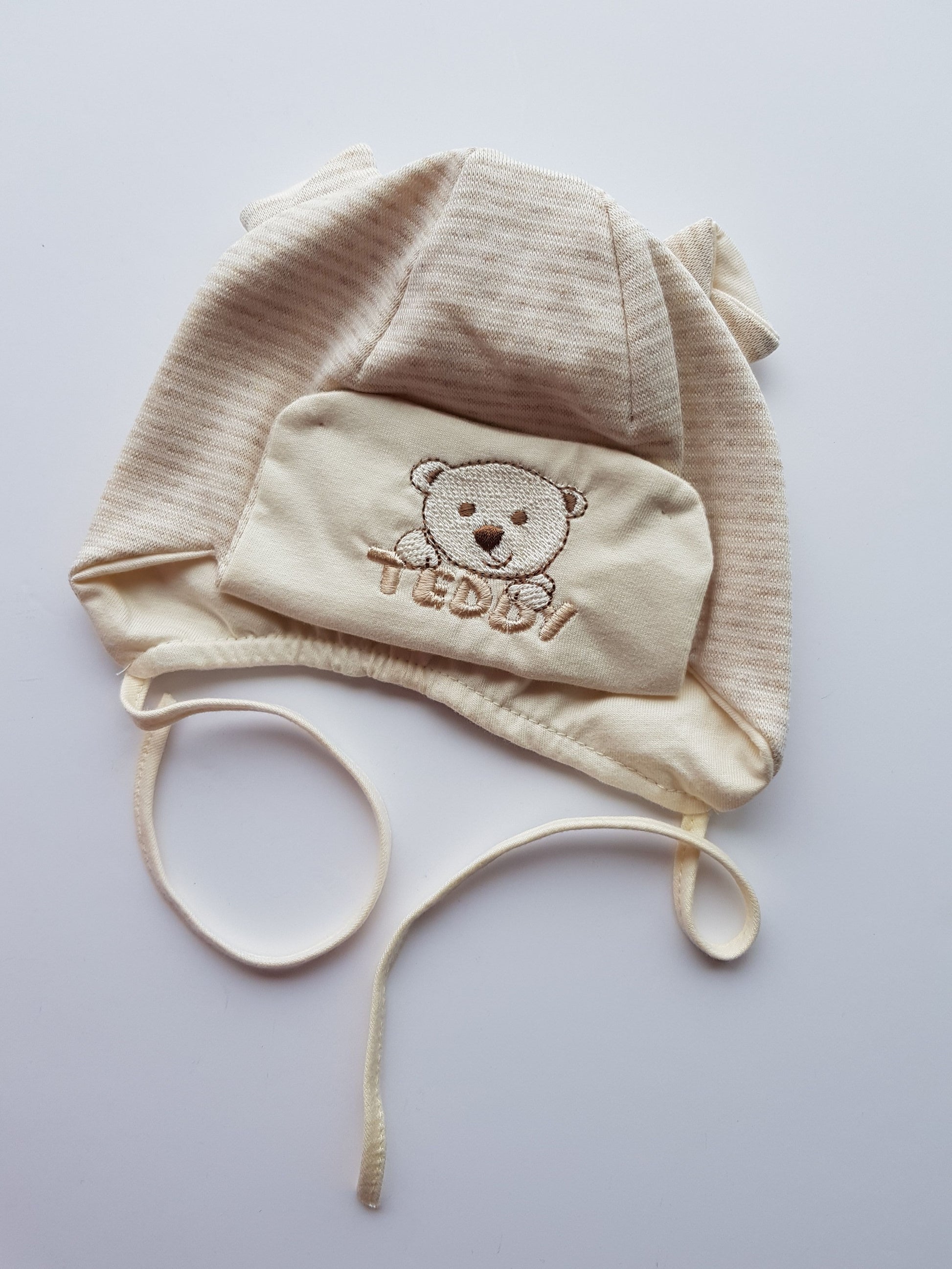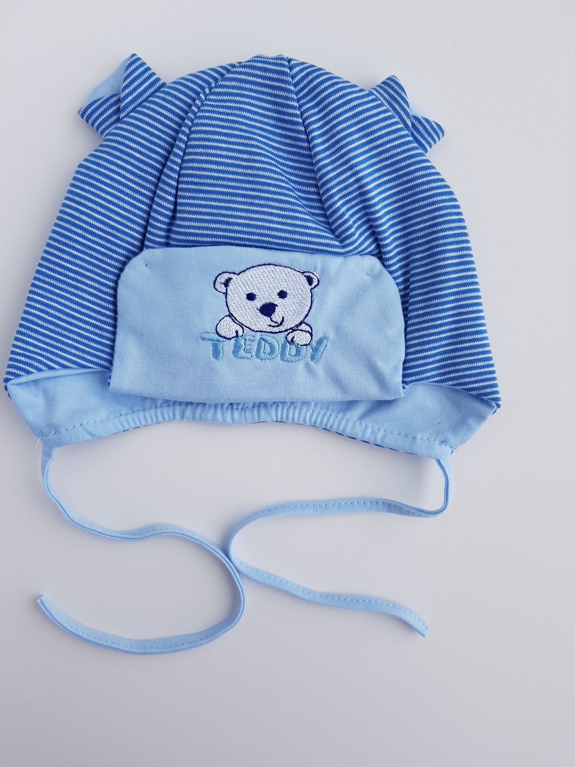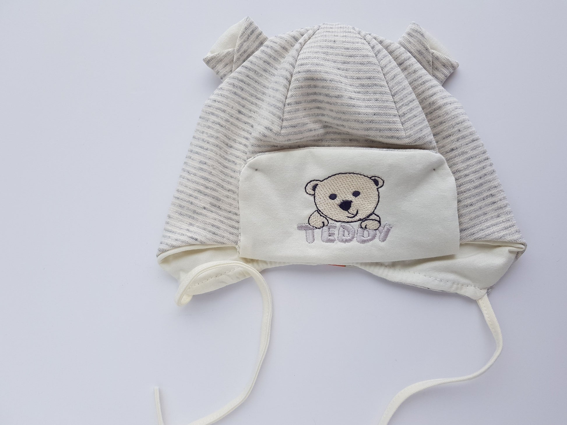 Hats for baby boys with ties. Available in sizes 38, 40, 42, 44, 46. Colours: cream, grey, blue. All hats are striped with white,blue,grey and cream rim at the front.