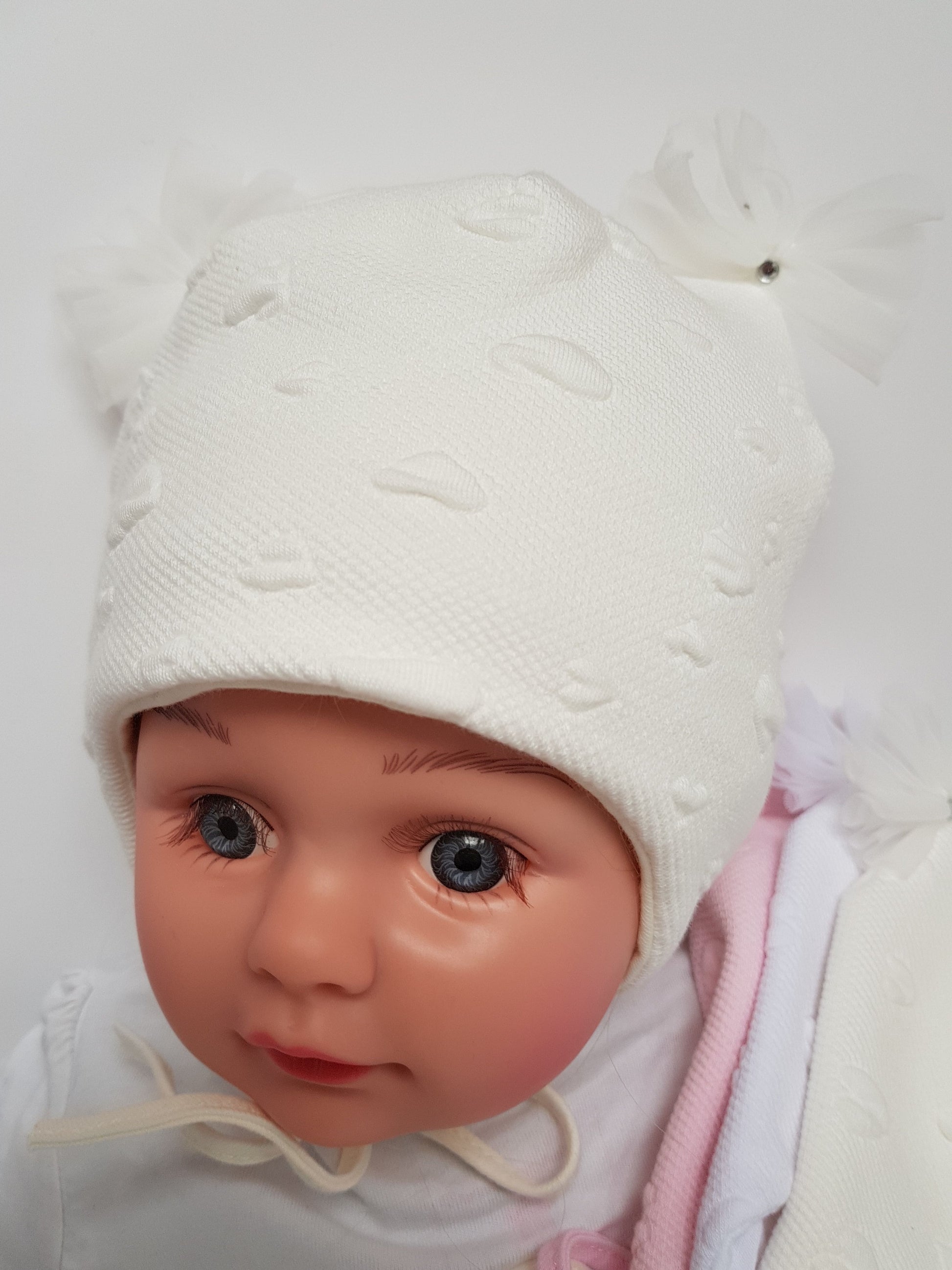 Hats for girls with ties. Have two little pom-poms. Available in sizes 36,38,40,42,44. From Newborn to 6 months old. Pick the colour you like- cream,pink or white.