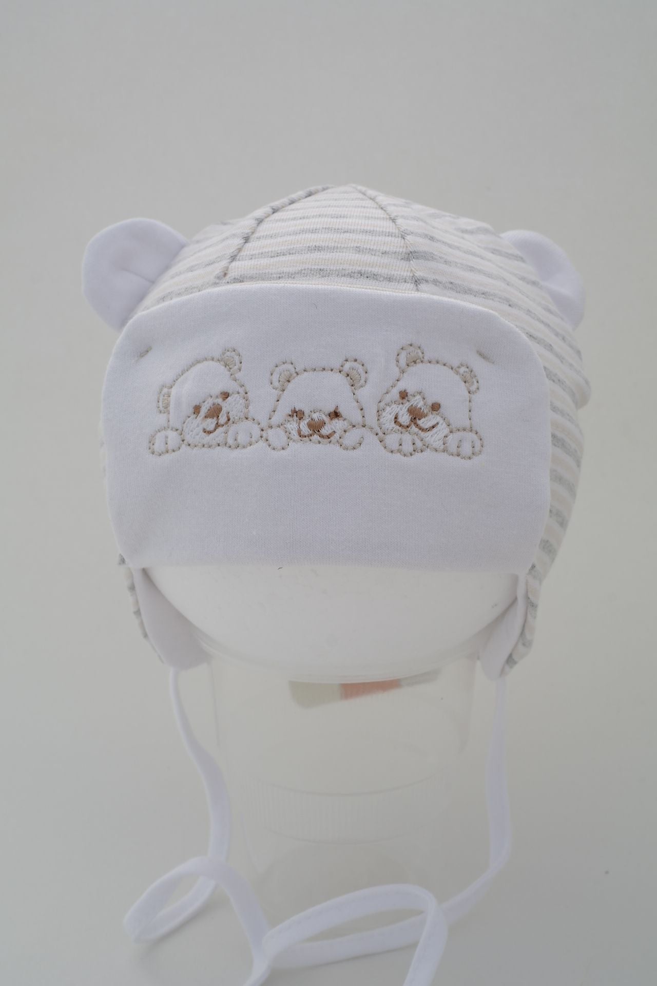 Stripy hats for a baby boys with ties. Available in sizes 36, 38, 40, 42, 44, 46. Colours: grey/white and brown/cream.