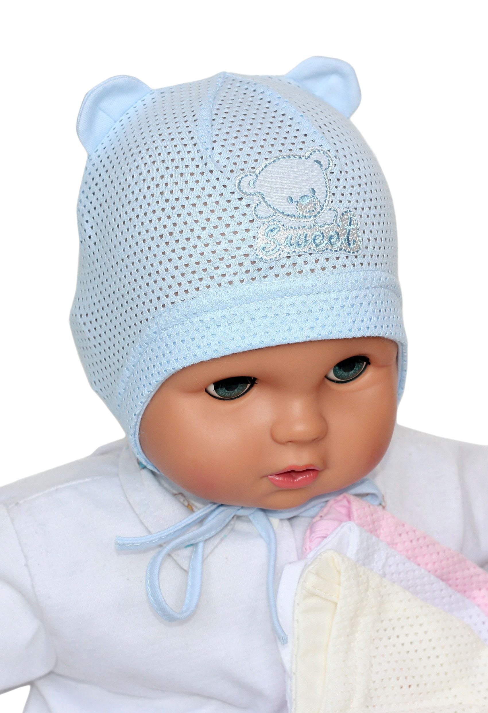 "Discover our adorable mesh hats with strings, perfect for summer! Made from 100% cotton, these lightweight hats provide comfort and security for your baby's head, keeping them protected from the sun and cool breezes. Stylish and functional, they add a lovely touch to any outfit and are available in white, cream, and blue, sized for newborns up to 7 months. The ideal accessory for keeping your little one comfy and chic!" Look down to choose the right size.