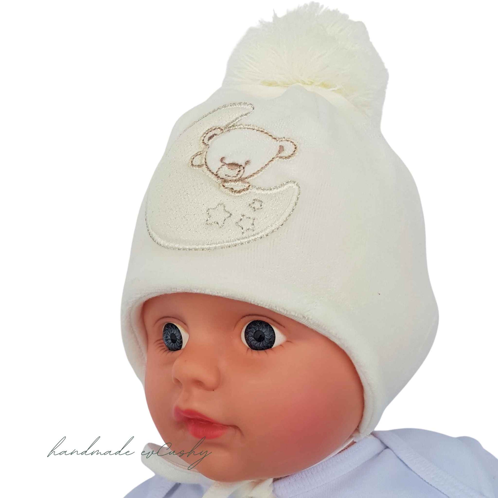 Cosy Teddy Bear on the Moon Baby Winter Hat: Secure Comfort in Cream