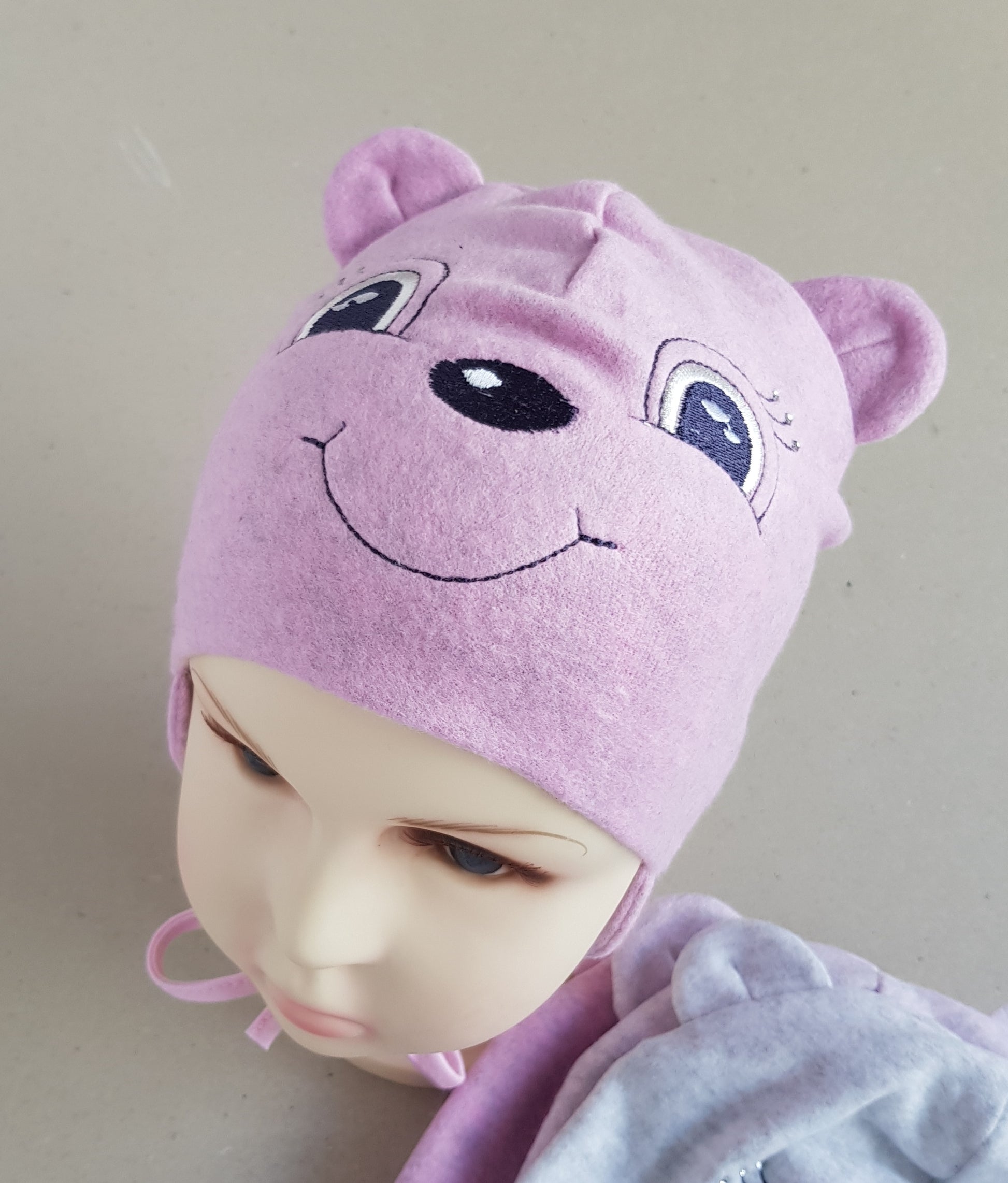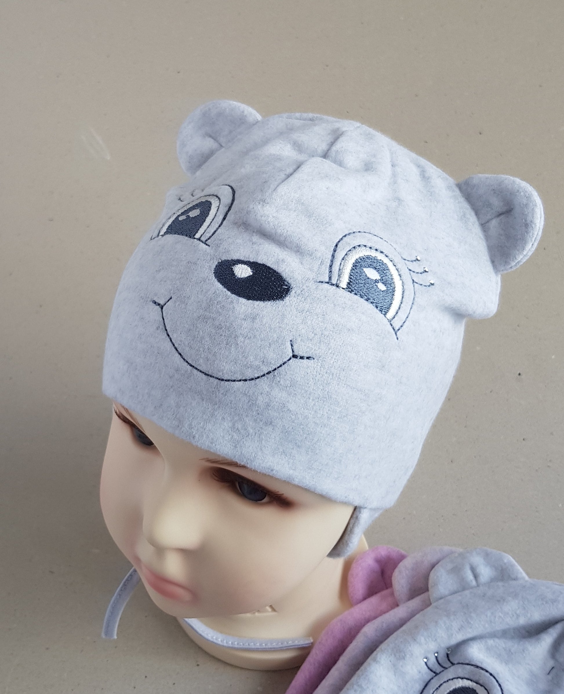 Baby Girl Hat With Ties Grey with Teddy ears and Teddy Face on the front.